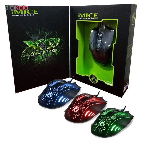 ماوس iMICE X9 Gaming که یکی از ماوس های گیمینگ خاص و بسیار عالی بازار میباشد و میتواند تمام نیاز های کاربر را پاسخگو باشد. این ماوس با داشتن قابلیت تنظیم سرعت و دقت بین 800 Dpi تا 2400 Dpi حتی برای کاربرانی که از نرمافزار های طراحی و گرافیکی استفاده میکنند نیز میتواند جزو بهترین گزینه ها باشد. از ویژگیهای این ماوس که ارزش خرید آن را بالا میبرد میتوان به 6D یا همان دارا بودن 6 کلید، کلید تنظیم سرعت و دقت ماوس بین 800/1200/1600/2400 Dpi، داشتن ال ای دی رنگی چند حالته که بصورت خودکار رنگ ها تعویض میکند، طراحی ارگونومیک مناسب با دست که در استفاده طولانی مدت هیچگونه خستگی در دست احساس نخواهید کرد، کابل کنفی با نویز گیر، دقت و سرعت بسیار بالا و وزن متعادل اشاره نمود. این ماوس با زیبایی بسیار بالایی که دارد میتواند جلوه میز کار یا سیستم گیمینگ شما را چند برابر نماید. کلیدهای ماوس برای ضربه پذیری بالا طراحی شده است و نیاز نیست نگران خرابی آنها در هنگام کار یا بازی باشید.