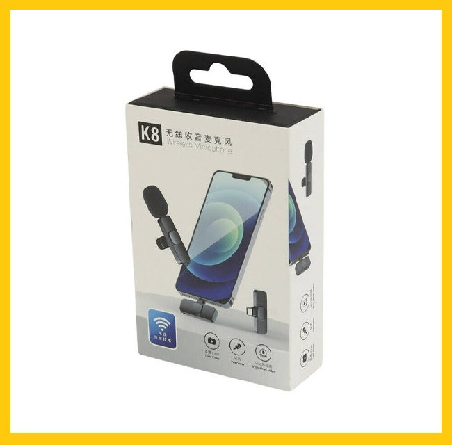 میکروفن بیسیم یقه ای k8 تایپ سی و لایتنینگ یک محصول با طراحی زیبا و ابعاد کوچک سبک و جمع و جور است که با گیره به یقه لباس وصل می گردد.